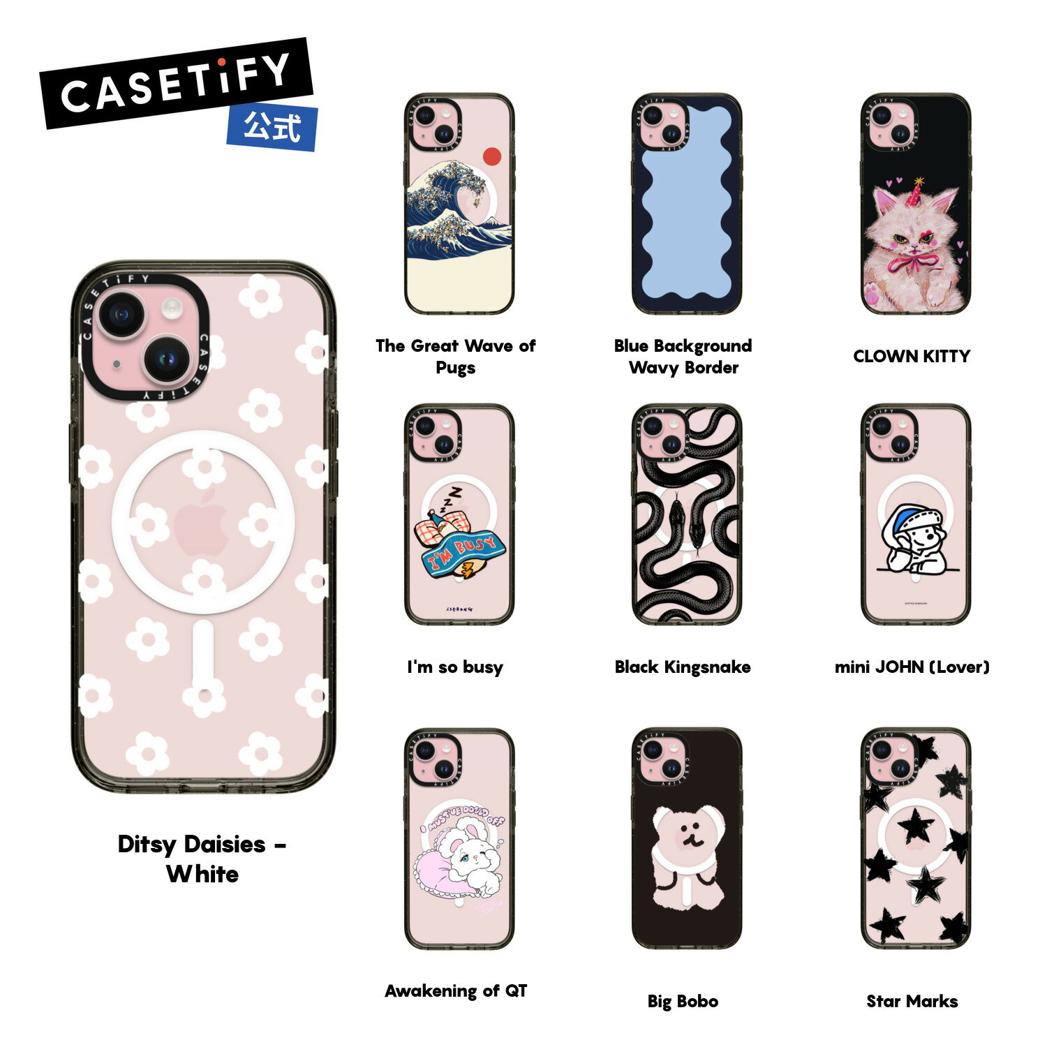 【公式】CASETiFY iPhone 15 インパクト ケース MagSafe対応 薄型 軽量 耐衝撃 Ditsy Daisies - White The Great Wave of Pugs Blue Background Wavy Border CLOWN KITTY I'm so busy Black Kingsnake mini JOHN (Lover) Awakening of QT Big Bobo クリア ブラック