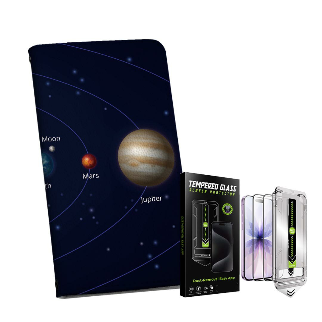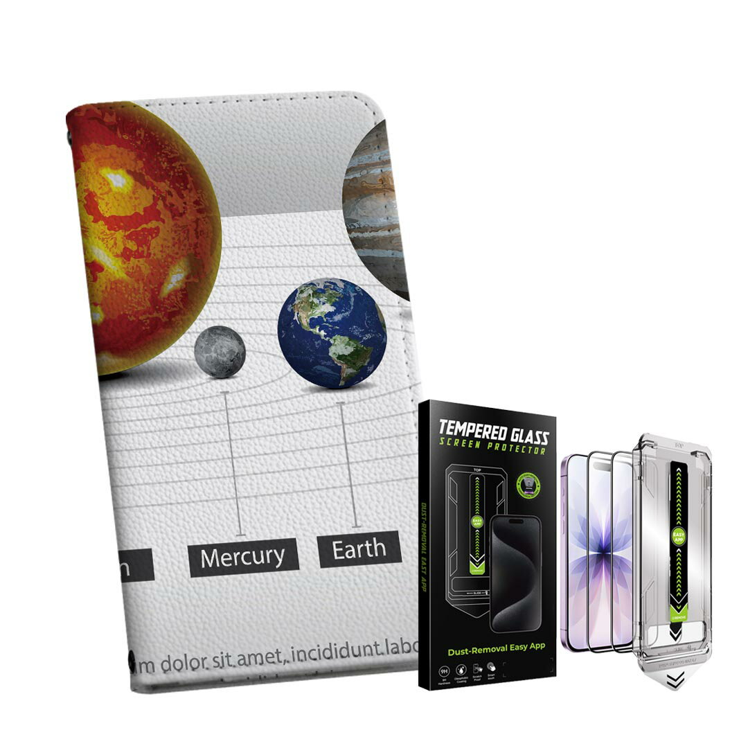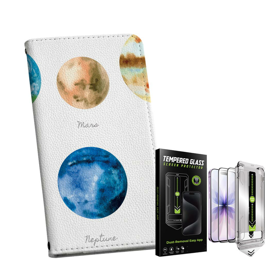 iPhone 13 6.1インチ 用 手帳型ケース ガラスフィルム 2枚 セット 各キャリア 共通対応 手帳型ケース カバー マグネット式 ピタッと閉まる レザーケース カード収納 ポケット igcase 033408 solar system 太陽系