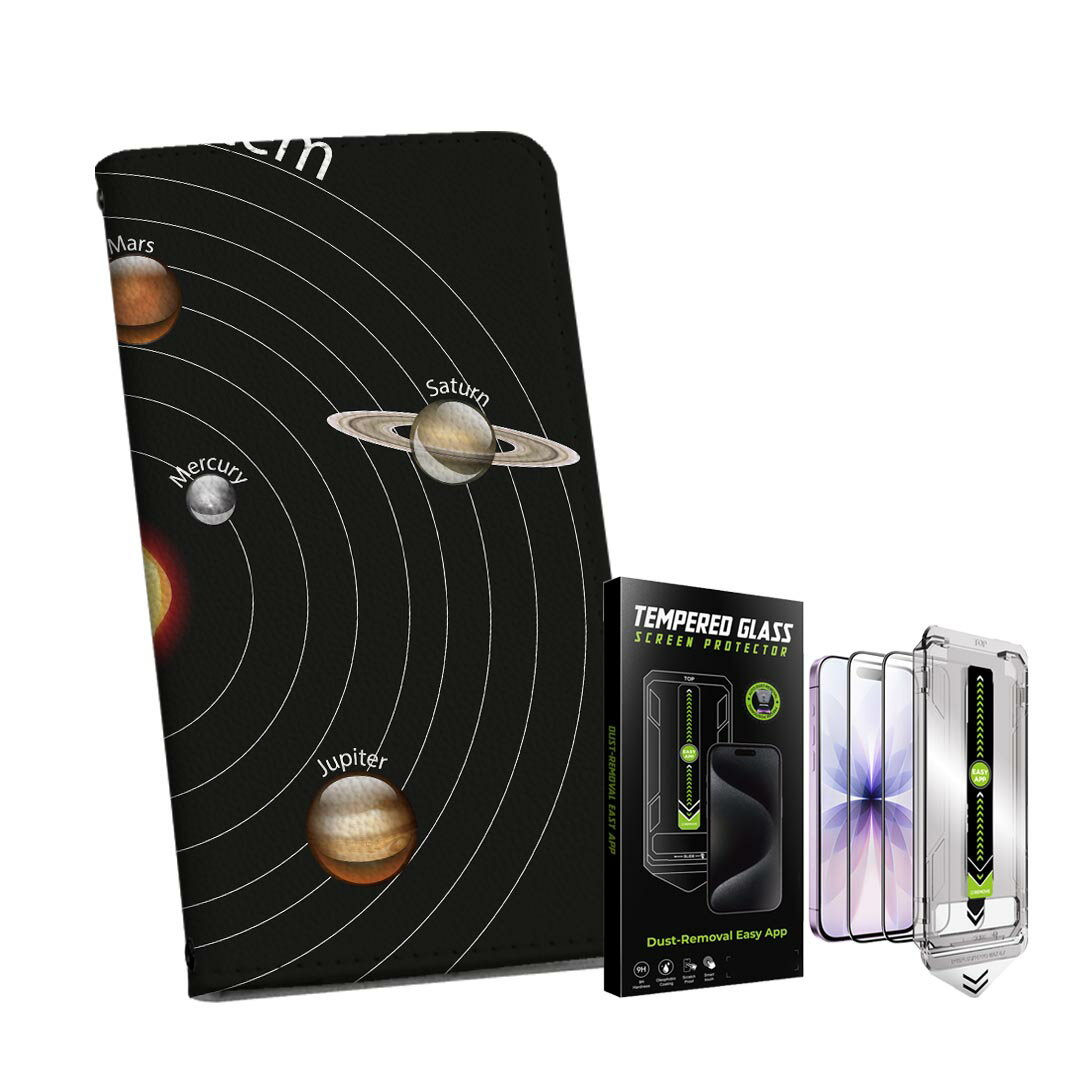 iPhone 13 6.1インチ 用 手帳型ケース ガラスフィルム 2枚 セット 各キャリア 共通対応 手帳型ケース カバー マグネット式 ピタッと閉まる レザーケース カード収納 ポケット igcase 033434 solar system 太陽系