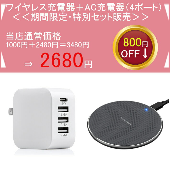 【お得セット】ワイヤレス充電器 AC充電器 ACアダプター のセット iPhone Xperia Galaxy 等のワイヤレス充電対応機種 軽量 軽い 対応 iPhone Qi 充電 ワイヤレスチャージャー 商品説明 ■商品名 :お得 ワイヤレス充電+AC充電器4ポート ■対応機種:iPhone,galaxy,Xperia等ワイヤレス充電対応機種 ■カラー:ブラック(ワイヤレス充電器)、ホワイト(AC充電器) ■注意事項:モニターの発色の具合によって実際のものと色が異なる場合があります ■保証期間 商品到着後、30日間は当店オリジナル保証を付きます。注文番号が保証書の代わりとなります。 商品到着後30日以内にレビューを投稿いただきますと延長保証いたします。商品到着後、1年間の延長保証となります。 保証は通常使用に対しての保証となります。落下、破損、火災、水漏れ等は保証外となります。 ■お得なセット内容 ワイヤレス充電器およびハイパワーなAC充電(Type-C 1ポート、USB 3ポート)でスマホライフを強力にサポート! セットで購入すれば800円引きで購入できます! 1)ワイヤレス充電器(当店販売価格:1,000円) ⇒シンプルでコストパフォーマンスの高いワイヤレス充電器 コンパクトで持ち運びにも便利なスタンダードなモデル 楽天ランキングで1位獲得!! 2)AC充電器(当店販売価格:2,480円) ⇒4ポート搭載の急速充電器となります。最近のiPhoneにはAC充電器が付属しておりません。 初めてスマートフォンを購入される場合には必須のアイテムとなります。 USB Type-C出力端子を1つ備えており、急速充電に対応しております。 ↓↓お得なセット販売はこちら↓↓↓↓各商品の詳細は画像をクリック↓↓ 【お得セット】ワイヤレス充電器 AC充電器 ACアダプター のセット iPhone Xperia Galaxy 等のワイヤレス充電対応機種 軽量 軽い 対応 iPhone Qi 充電 ワイヤレスチャージャー 商品説明 ■商品名 :お得 ワイヤレス充電+AC充電器4ポート ■対応機種:iPhone,galaxy,Xperia等ワイヤレス充電対応機種 ■カラー:ブラック(ワイヤレス充電器)、ホワイト(AC充電器) ■注意事項:モニターの発色の具合によって実際のものと色が異なる場合があります ■保証期間 商品到着後、30日間は当店オリジナル保証を付きます。注文番号が保証書の代わりとなります。 商品到着後30日以内にレビューを投稿いただきますと延長保証いたします。商品到着後、1年間の延長保証となります。 保証は通常使用に対しての保証となります。落下、破損、火災、水漏れ等は保証外となります。 ■お得なセット内容 ワイヤレス充電器およびハイパワーなAC充電(Type-C 1ポート、USB 3ポート)でスマホライフを強力にサポート! セットで購入すれば800円引きで購入できます! 1)ワイヤレス充電器(当店販売価格:1,000円) ⇒シンプルでコストパフォーマンスの高いワイヤレス充電器 コンパクトで持ち運びにも便利なスタンダードなモデル 楽天ランキングで1位獲得!! 2)AC充電器(当店販売価格:2,480円) ⇒4ポート搭載の急速充電器となります。最近のiPhoneにはAC充電器が付属しておりません。 初めてスマートフォンを購入される場合には必須のアイテムとなります。 USB Type-C出力端子を1つ備えており、急速充電に対応しております。 ↓↓お得なセット販売はこちら↓↓