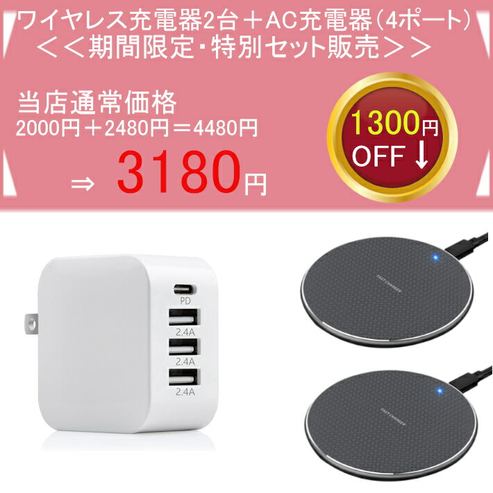 【お得セット】ワイヤレス充電器 AC充電器 ACアダプター のセット iPhone Xperia Galaxy 等のワイヤレス充電対応機種 軽量 軽い 対応 iPhone Qi 充電 ワイヤレスチャージャー 商品説明 ■商品名 :お得 ワイヤレス充電器2台+AC充電器4ポート ■対応機種:iPhone,galaxy,Xperia等ワイヤレス充電対応機種 ■カラー:ブラック(ワイヤレス充電器)、ホワイト(AC充電器) ■注意事項:モニターの発色の具合によって実際のものと色が異なる場合があります ■保証期間 商品到着後、30日間は当店オリジナル保証を付きます。注文番号が保証書の代わりとなります。 商品到着後30日以内にレビューを投稿いただきますと延長保証いたします。商品到着後、1年間の延長保証となります。 保証は通常使用に対しての保証となります。落下、破損、火災、水漏れ等は保証外となります。 ■お得なセット内容 ワイヤレス充電器2台およびハイパワーなAC充電(Type-C 1ポート、USB 3ポート)でスマホライフを強力にサポート! セットで購入すれば1300円引きで購入できます! 1)ワイヤレス充電器2台(当店販売価格:2,000円) ⇒シンプルでコストパフォーマンスの高いワイヤレス充電器 コンパクトで持ち運びにも便利なスタンダードなモデル 楽天ランキングで1位獲得!! 2)AC充電器(当店販売価格:2,480円) ⇒4ポート搭載の急速充電器となります。最近のiPhoneにはAC充電器が付属しておりません。 初めてスマートフォンを購入される場合には必須のアイテムとなります。 USB Type-C出力端子を1つ備えており、急速充電に対応しております。 ↓↓お得なセット販売はこちら↓↓↓↓各商品の詳細は画像をクリック↓↓ 【お得セット】ワイヤレス充電器 AC充電器 ACアダプター のセット iPhone12 Xperia Galaxy 等のワイヤレス充電対応機種 軽量 軽い 対応 iPhone Qi 充電 ワイヤレスチャージャー 商品説明 ■商品名 :お得 ワイヤレス充電2台+AC充電器4ポート ■対応機種:iPhone,galaxy,Xperia等ワイヤレス充電対応機種 ■カラー:ブラック(ワイヤレス充電器)、ホワイト(AC充電器) ■注意事項:モニターの発色の具合によって実際のものと色が異なる場合があります ■保証期間 商品到着後、30日間は当店オリジナル保証を付きます。注文番号が保証書の代わりとなります。 商品到着後30日以内にレビューを投稿いただきますと延長保証いたします。商品到着後、1年間の延長保証となります。 保証は通常使用に対しての保証となります。落下、破損、火災、水漏れ等は保証外となります。 ■お得なセット内容 ワイヤレス充電器2台およびハイパワーなAC充電(Type-C 1ポート、USB 3ポート)でスマホライフを強力にサポート! セットで購入すれば1300円引きで購入できます! 1)ワイヤレス充電器2台(当店販売価格:2,000円) ⇒シンプルでコストパフォーマンスの高いワイヤレス充電器 コンパクトで持ち運びにも便利なスタンダードなモデル 楽天ランキングで1位獲得!! 2)AC充電器(当店販売価格:2,480円) ⇒4ポート搭載の急速充電器となります。最近のiPhoneにはAC充電器が付属しておりません。 初めてスマートフォンを購入される場合には必須のアイテムとなります。 USB Type-C出力端子を1つ備えており、急速充電に対応しております。 ↓↓お得なセット販売はこちら↓↓