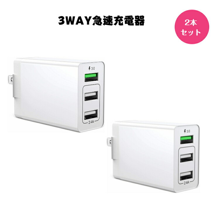 【PSE認証】 USB充電器 QC3.0 搭載 ACアダプター 折り畳み式プラグ 30W 3ポートUSB急速充電器 軽量 コンパクト AC充電器 Quick Charge 2本セット