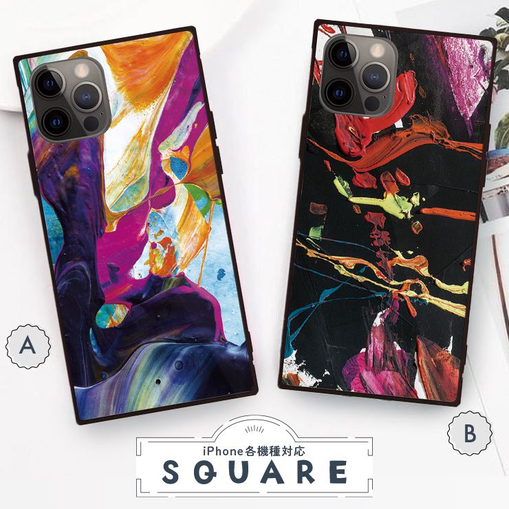iPhone16 16e ケース 16Pro 16ProMax 16Plus ケース iPhone 15 pro iPhone14 13 12pro ケース 背面ガラス スクエア 四角 強化ガラス 軽量 おしゃれ 絵具 油彩 アート グラフィティ カラフル 派手 ポップ 大人 カッコいい