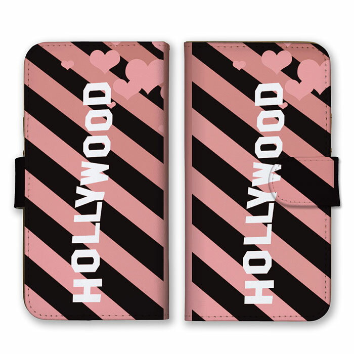 全機種対応 手帳型 スマホケース SIMフリー対応 斜線 ライン 線 ハート 柄 文字 英語 HOLLYWOOD おしゃれ かわいい オススメ シンプル 個性的 斬新 サーモンピンク 黒 白 ブラック set16947 iPhone14 13 12mini Pro Max SE(第3世代) Galaxy Xperia AQUOS