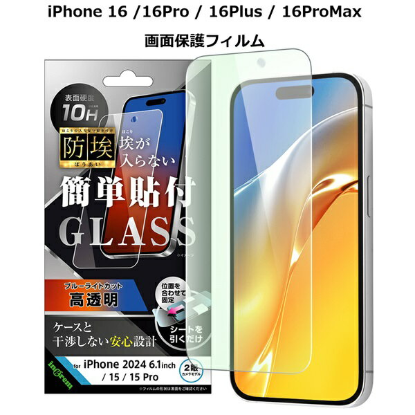 iPhone 16 16Pro 16Plus 16ProMax フィルム 防埃 ガラスフィルム ブルーライトカット 光沢 簡単貼り付け 平面保護 硬度10H 送料無料 iPhone 16 / 15 / 15 Pro 16 Pro 16 Plus / 15 Plus / 15 Pro Max 16ProMax
