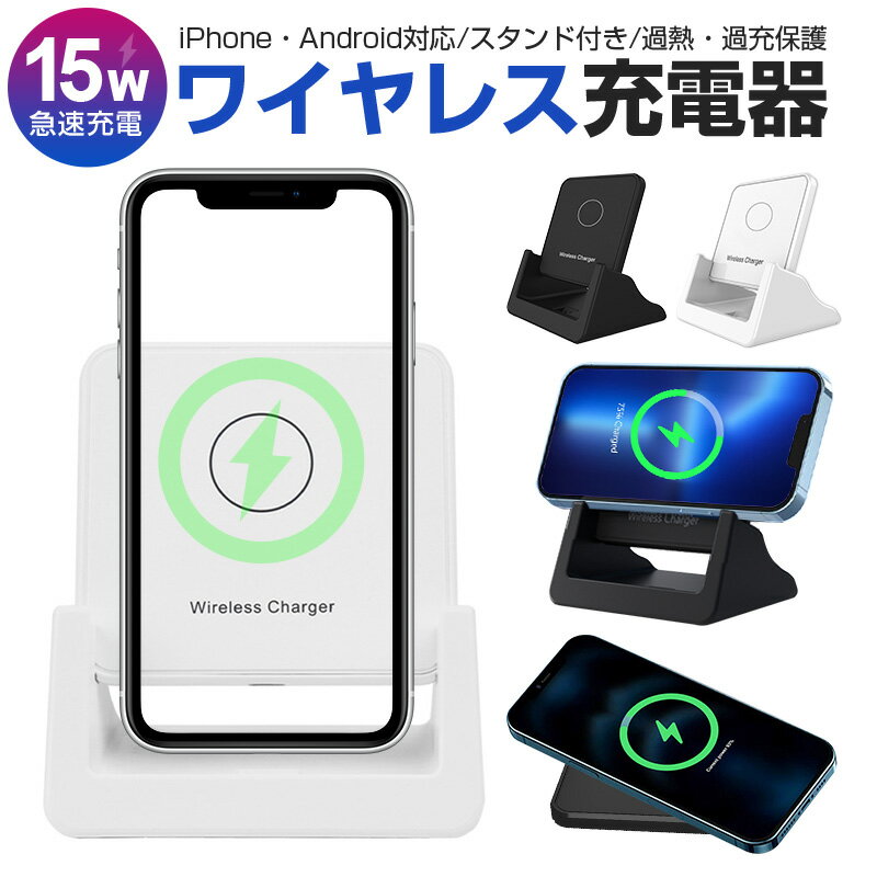 ワイヤレス 充電器 ワイヤレス充電器 Qi 15W 急速 充電 スタンド Android iPhone 置くだけ充電 iPhone15 iPhone12 Qi急速充電対応 Type-C コンパクト 薄型 小型 高速充電 横置き充電 スマホスタンド 過充電保護 安全 ショート防止 多機種対応 galaxy HUAWEI 充電
