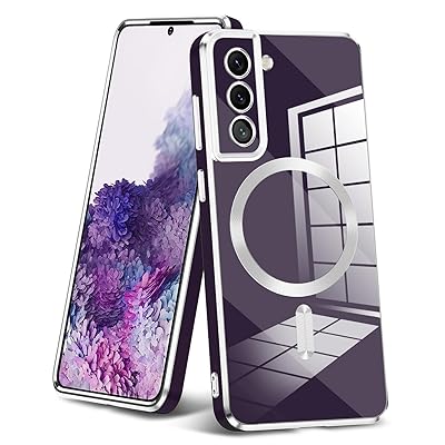 Galaxy S21 用ケース マグネット搭載 耐衝撃 TPU ケース レンズ保護 メッキ加工 磁気スマホケース ソフト ワイヤレス充電 ストラップホール付き 黄変なし 薄型 軽量 ギャラクシーS21 用カバー メッキ枠 人気 おしゃれ パープル J