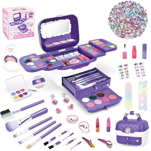 豪華な72点の女の子メイクセット:豪華な子供用化粧品セットは72点が含まれています。アイシャドウ(17種類のグリッター、14色のマット、6色のポータブルアイシャドウパレット)、リップグロス、チーク、リップスティック、メイクブラシ、ネイルポリッシュ、ネイルシール、ネイルファイル、鏡、ユニコーンのヘアクリップとヘアゴム、ヘアピンおよび化粧鏡、収納バックスなど。子供の様々おままごと、なりきり、ごっこ遊びのニーズを満たし、素敵なメイクアップおもちゃです。 無毒材質水で落ちる子供メイクおもちゃ:このメイクおもちゃは肌にやさしく、石鹸と水で簡単に落とせます。お子様の肌にきずを与えることはありません 美意識を育てるメイクおもちゃセット:この化粧品セットを使うことで、子供は自分の美意識を育て、コーディネーションに合わせてメイクを楽しむことができます。また、友達と一緒に化粧をすることで、社交能力も向上させることができます。