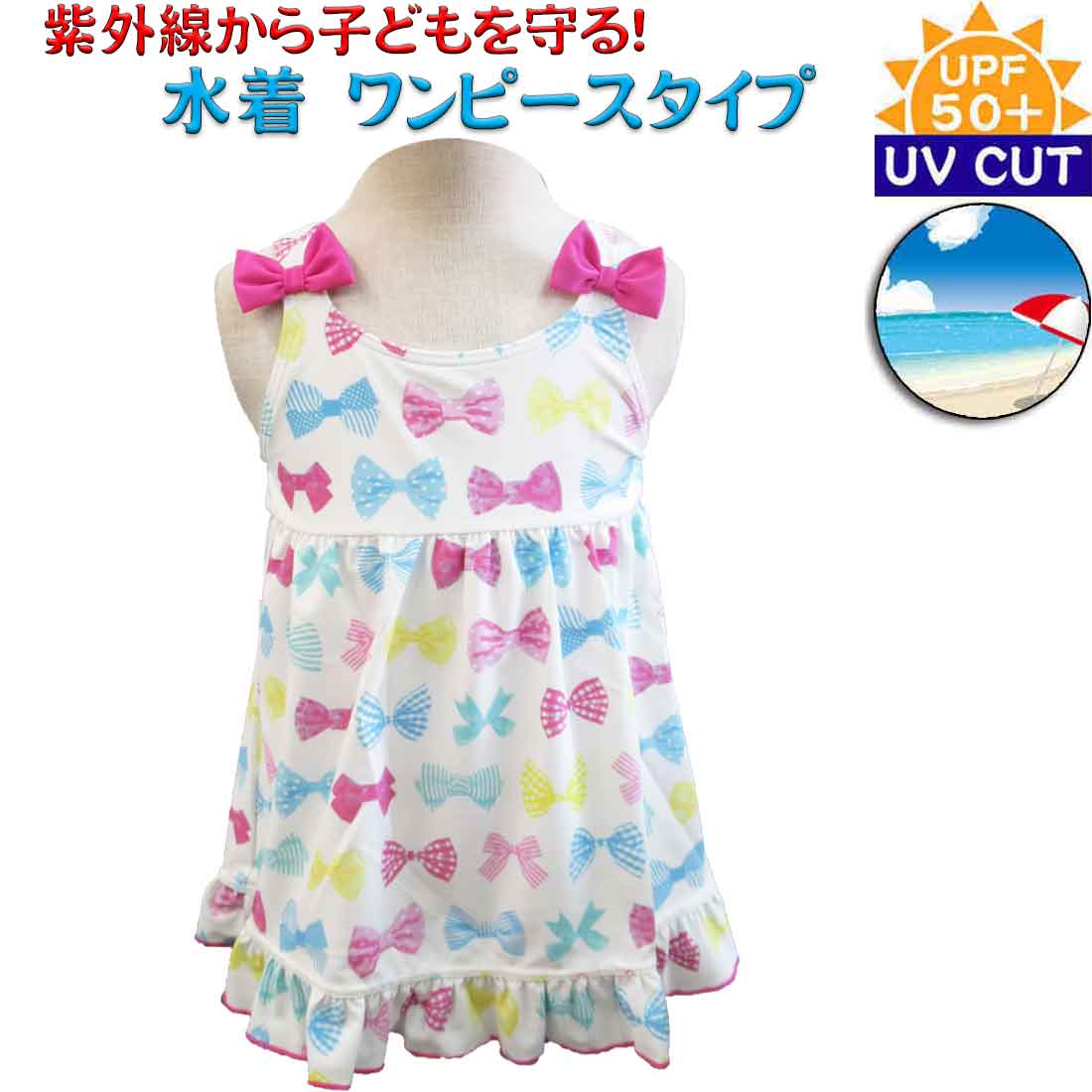 水着 ワンピースタイプ ホワイト×リボン柄 紫外線カット UV CUT オレンジボンボン 女の子 夏休み 海 プール 日焼け