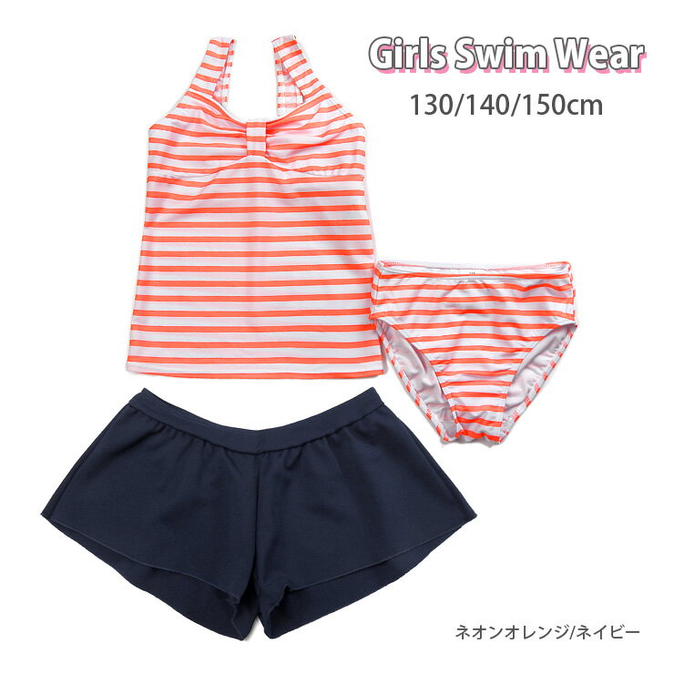 セパレート タンキニ 水着 3点セット 女の子 130 140 150 5139 上下セット タンクトップ ショートパンツ フレアパンツ 女児 子ども パッドポケット付 ボーダー柄 紺 ネイビー ネオンオレンジ