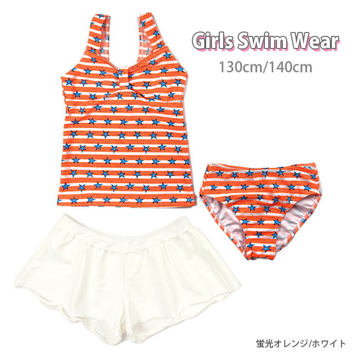セパレート タンキニ 水着 3点セット 女の子 130 140 5139 上下セット タンクトップ ショートパンツ フレアパンツ 女児 子ども パッドポケット付 ボーダー 星 スター ネオンオレンジ ホワイト