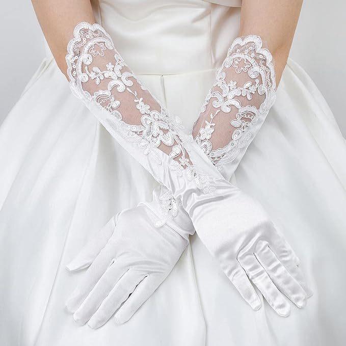 ・対象: レディース・スタイル: 中長丈5本指手袋・素材: サテンレース・: ・カラー展開: オフホワイト、ホワイト