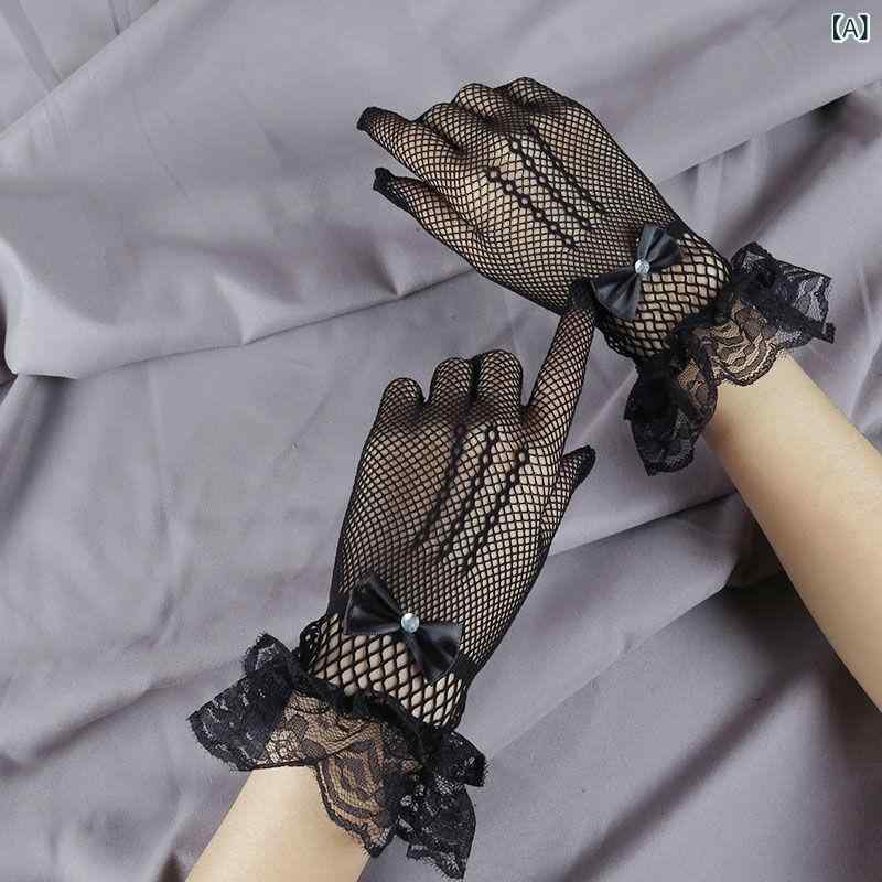 手袋 女性用 薄手 メッシュ レース セクシー 結婚式 パーティー ウェディンググローブ ラインストーン リボン 透け感 UVカット 春夏 ポリエステル エレガント ブラック ホワイト