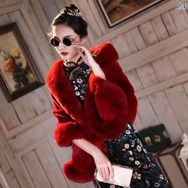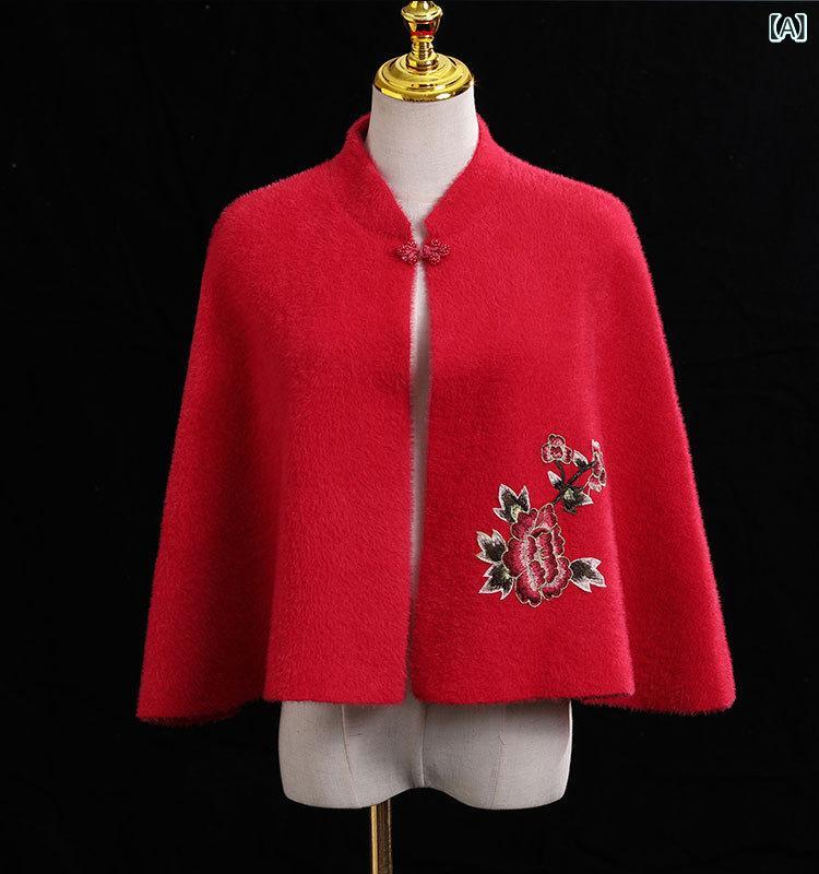 ショール レディース 女性用 チャイナドレス用 フォーマル 婚礼 結婚式 フェイクミンク ミンク調 ファー ニット カーディガン アウター ケープ ポンチョ 刺繍 レッド ブラック ホワイト ワインレッド