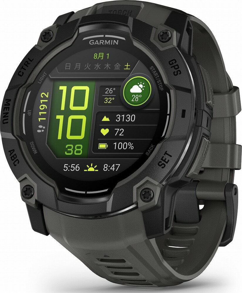 【ソーラー充電による無制限バッテリー】Instinct 3は第三世代のソーラーパネルを搭載し充電効率がアップ。ソーラー充電によりスマートウォッチモードで無制限ににバッテリーが持続。 改良されたMIPディスプレイとバックライトで、どんな環境でも見やすいディスプレイを実現。【耐久性に優れた設計】アメリカ国防総省MIL規格「MIL-STD-810」準拠の高い耐熱性、耐衝撃性および耐水性を有しています。10気圧(100m)防水で、過酷なアウトドア環境にも耐えるタフな設計です。【LEDフラッシュライトを内蔵】暗い場所で安心して行動するために、LEDフラッシュライトを内蔵。夜間のランニング時にはピッチに合わせて自動で光量が変化します。また、赤色LEDモードにも対応しています。【健康モニタリング】心拍数、睡眠モニタリング、ストレスレベルなど、日常生活やアクティビティ中の健康をモニタリングできます。【ナビゲーション機能】コンパス、気圧高度計、マルチGNSSなどのセンサーを利用して、目的地までのナビゲーションを行えます。【GNSSマルチバンドに対応】複数のグローバルナビゲーション衛星システム(GPS、GLONASS、Galileo、みちびき(補完信号))を利用できます。ビル街や森林など干渉の多い環境でも精度の高い位置情報を取得できます。環境に応じて最適なGPSモードを自動的に選択するSatIQ技術も搭載。【スポーツアプリ】ランニング、ウォーキング、バイク、登山、水泳、スキー、サーフィンなど、豊富なアクティビティプロフィールが搭載されています。【HRVステータス】睡眠中の心拍変動を測定することで、健康状態をより深く理解できます。【ストレスレベル計測】心拍変動によりストレスレベルのスコアを計算して表示します。落ち着いた日なのか、バランスのとれた日なのか、それともストレスの多い日を過ごしているのかを確認します。【モーニングレポート】朝起きたときに、睡眠、回復、トレーニングの概要、HRVステータスなどの情報を一目でチェックできます。表示項目をカスタマイズすることもできます。【フィットネス年齢】実年齢や運動量、安静時の心拍数、身長・体重などから「身体の年齢」を推定する機能です。身体が実年齢に対して若いか、それとも老いているかチェックしてみましょう。【Garmin Connectアプリと同期】無料のGarmin Connectアプリで健康とフィットネスに関する情報をすべて確認できます。 友達とつながったり、活動を比較したり、アクティビティを共有したり、競争したり、バッジを獲得するためのチャレンジに挑戦することができます。【通知機能】互換性のあるスマートフォンとペアリングすれば、ウォッチで電子メールやテキスト、アプリの通知を受信できます。 Androidスマートフォンならテキストに返信することもできます。【ABC センサー】高度データ用の高度計、天候を観測する気圧計、そして電子3軸コンパスが含まれるABCセンサーを利用して現在の状況を把握できます。【Garmin Pay/Suica タッチ決済】提携プロバイダを通した Garmin Pay の非接触型決済ソリューションを利用することで、決済を簡単に行えます。Suica対応で、買い物や電車での移動もスムーズです。【Garminシェア】保存した位置情報、コース、ワークアウトを、友達のGarmin デバイスと簡単に共有できます。