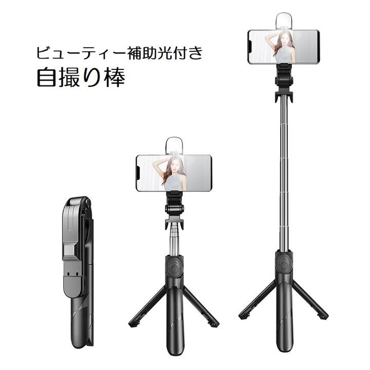送料無料 セルカ棒 自撮り棒 LEDライト Bluetooth リモコン付き USB充電 三脚付き スタンド付き スマホ用 ワイヤレス 360度回転 伸縮 コンパクト セルフィー スティック スマートフォン用 撮影用グッズ ブラック ホワイト ピンク リチウム