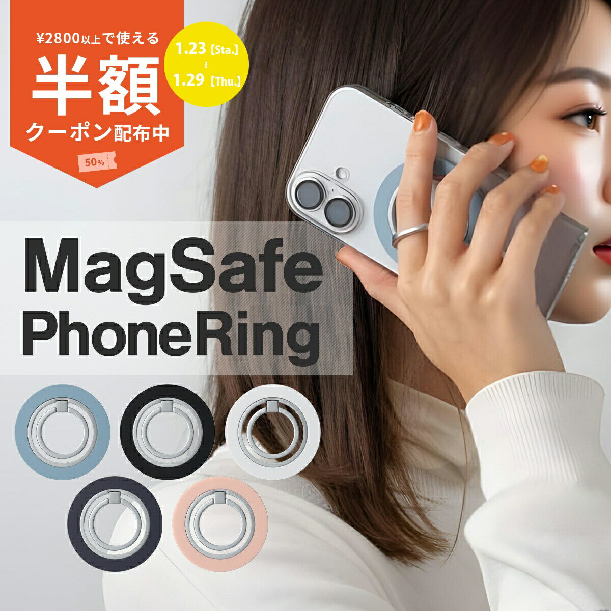 商品名称MagSafe 対応 リング付き スマホグリップ適応機種すべてのスマートフォンにご利用いただけますカラー01.ホワイト02.ピンク03.ブルー04.パープル05.ブラック商品説明おすすめする5つのポイント1.落下を防止するリングが活躍。落下防止グッズの定番アイテム、スマホリングがMagSafe対応に。2.MagSafe対応で付け外しかんたん。本体そのままやMagSafe対応ケースで今までにない快適脱着。MagSafe非対応用のメタルステッカー同梱で様々なケースでご利用いただけます。3.リングの位置は360度回転×90度起立。リングの土台がぐるぐると360度回転して使いやすい角度へかんたん調節。4.スマホスタンドになるので動画の視聴もおまかせテーブルや社内での動画の視聴はもちろんキッチンでのレシピの確認などに大活躍。5.片手でのスマホ操作が格段に快適になります。片手で操作しにくいサイズのスマホでも指の届く範囲が広がります。※本来の用途以外には使用しないでください。※生産ロットにより使用に問題ない程度の製造痕、微細な仕様が写真と異なる場合があります。※本製品を使用したことによる本体の破損や故障については責任を負いかねます。予めご了承ください。商品名称MagSafe 対応 リング付き スマホグリップ適応機種すべてのスマートフォンにご利用いただけますカラー01.ホワイト02.ピンク03.ブルー04.パープル05.ブラック商品説明おすすめする5つのポイント1.落下を防止するリングが活躍。落下防止グッズの定番アイテム、スマホリングがMagSafe対応に。2.MagSafe対応で付け外しかんたん。本体そのままやMagSafe対応ケースで今までにない快適脱着。MagSafe非対応用のメタルステッカー同梱で様々なケースでご利用いただけます。3.リングの位置は360度回転×90度起立。リングの土台がぐるぐると360度回転して使いやすい角度へかんたん調節。4.スマホスタンドになるので動画の視聴もおまかせテーブルや社内での動画の視聴はもちろんキッチンでのレシピの確認などに大活躍。5.片手でのスマホ操作が格段に快適になります。片手で操作しにくいサイズのスマホでも指の届く範囲が広がります。※本来の用途以外には使用しないでください。※生産ロットにより使用に問題ない程度の製造痕、微細な仕様が写真と異なる場合があります。※本製品を使用したことによる本体の破損や故障については責任を負いかねます。予めご了承ください。