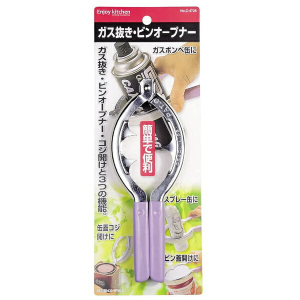ガスボンベ・スプレー缶を挟むだけで、カンタンにガス抜きができるガス抜きだけでなく、ビンのフタ開け、缶ブタのこじ開けにも■サイズ: 70×190×20mm■材質: 金属部 = 鉄(クロムめっき) 樹脂部 = 塩化ビニル樹脂(耐熱温度70度)