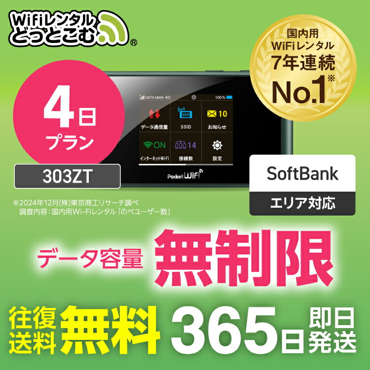 【送料無料・即日発送】WiFi レンタル 無制限 4日プラン レンタルwifi レンタルwi-fi wifiレンタル ワイファイレンタル ポケットWiFi レンタルワイファイ Wi-Fi ソフトバンク 空港受取 303ZT 引っ越しwifi 入院wifi 一時帰国wifi 国内wifi 在宅勤務 テレワーク 契約不要