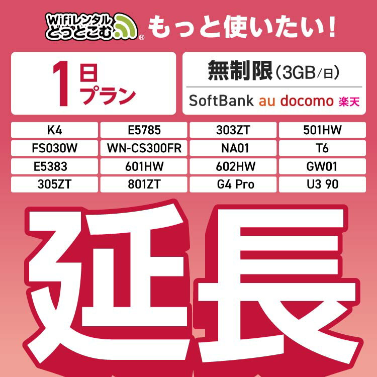 【延長専用】SoftBank 無制限 K4 501HW 303ZT E5785 FS030W NA01 WN-CS300FR E5383 T6 305ZT 801ZT 無制限 wifi レンタル 延長 専用 1日 ポケットwifi Pocket WiFi レンタルwifi ルーター wi-fi 中継器 wifiレンタル ポケットWiFi ポケットWi-Fi WiFiレンタルどっとこむ