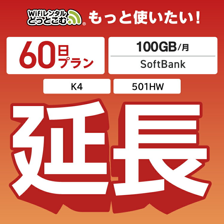 ※延長利用のご案内※ <延長商品のご購入について> こちらの商品は、すでにレンタル中のお客様限定の延長専用商品となっております。 現在ご利用中のWi-Fiルーターを継続利用するための延長専用プランです。 ご不明点などございましたらお問い合わせくださいませ。 <支払方法について> 本商品は発送を伴わないため、「代引き決済」「後払い決済」でのお支払いは不可となります。 上記の支払方法を選択いただいた場合は、注文キャンセルとさせていただきます。ご了承ください。WiFiレンタル 月間 100GB 延長プラン 延長プランについて [ 100GB / 月 プラン ]の下記端末をレンタル中のお客様限定の延長専用商品となっております。 K4 / 501HW その他日数プランをチェックする ご購入について ・延長したい日数を個数として選択いただきご購入ください。 ・延長プランの購入時に、ご利用中のWiFiルーター端末にあるバーコードシールのIMEI番号(15桁)、もしくはMAC番号(12桁)をご入力ください。 ・安心補償サービスをご利用中の方は、必ず「安心補償:加入する」を選択いただきご購入ください。