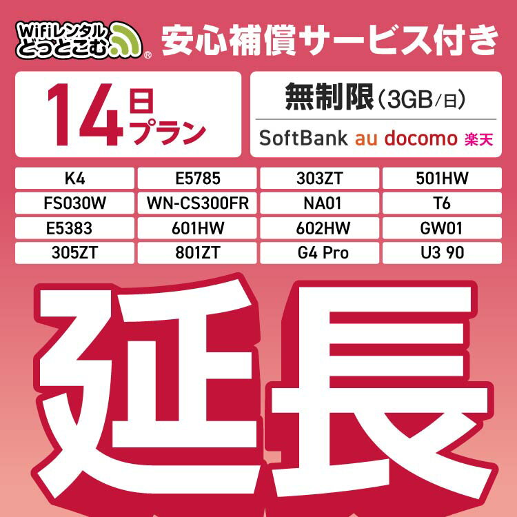【延長専用】安心補償付き SoftBank 無制限 K4 501HW 303ZT E5785 FS030W NA01 WN-CS300FR E5383 T6 無制限 wifi レンタル 延長 専用 14日 ポケットwifi Pocket WiFi レンタルwifi ルーター wi-fi 中継器 wifiレンタル ポケットWiFi ポケットWi-Fi WiFiレンタルどっとこむ