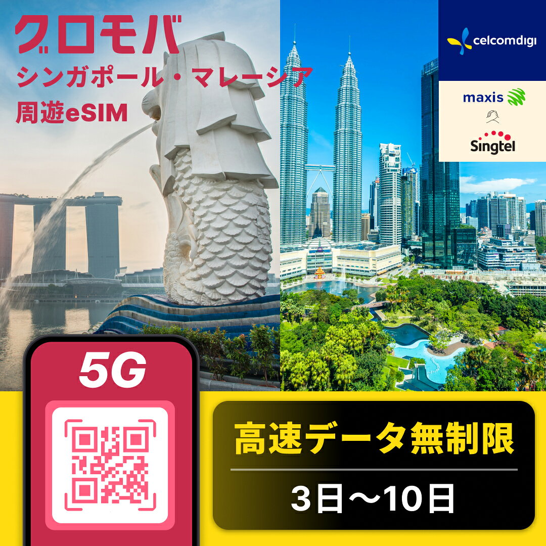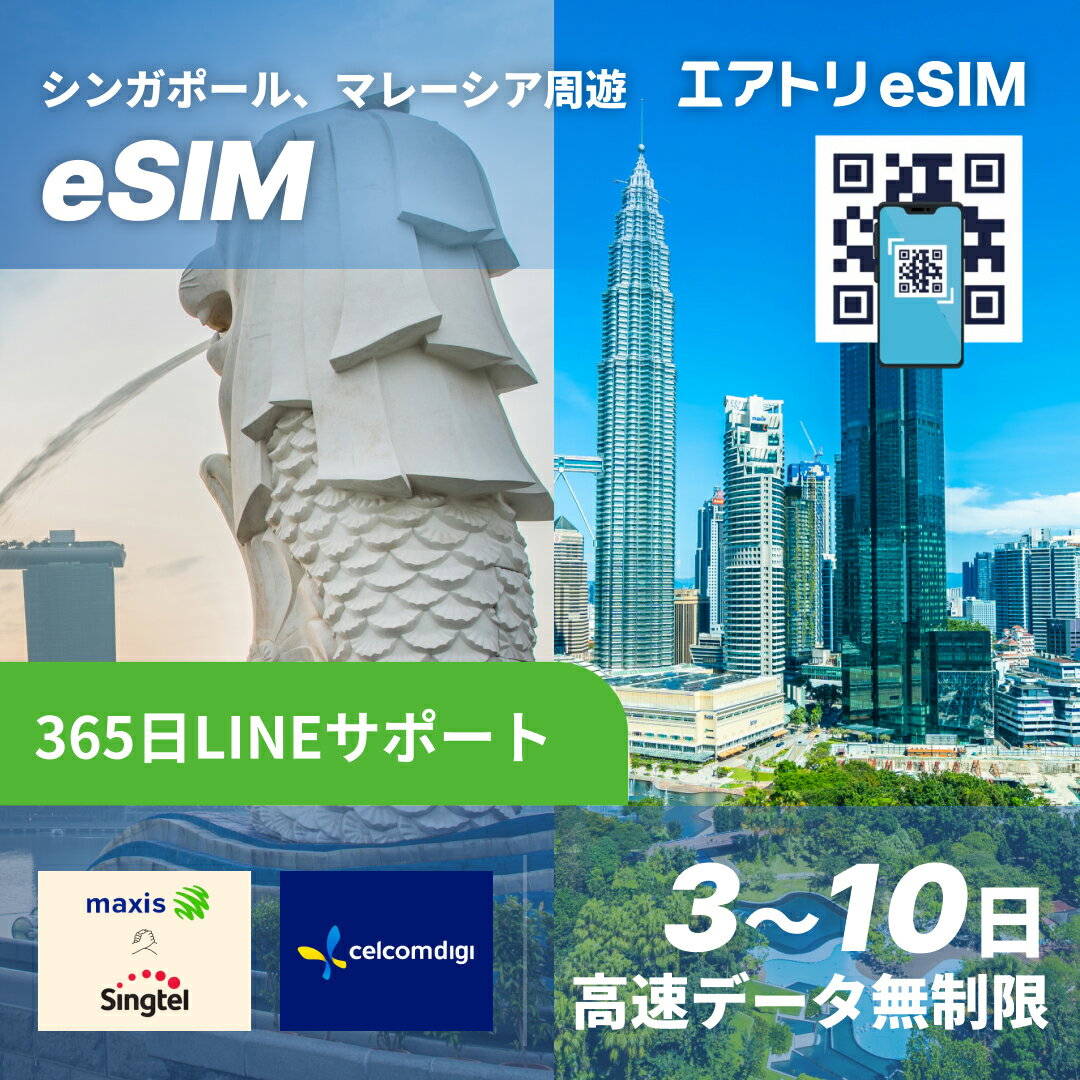 シンガポール・マレーシア周遊 eSIM Singtel & Maxis / Celcom / Digi 高速 データ 無制限 5G esim【 3日 4日 5日 7日 10日 3日~10日 高速データ 】 eSIM イーシム データ通信 高速 出張 留学 旅行 iphone android