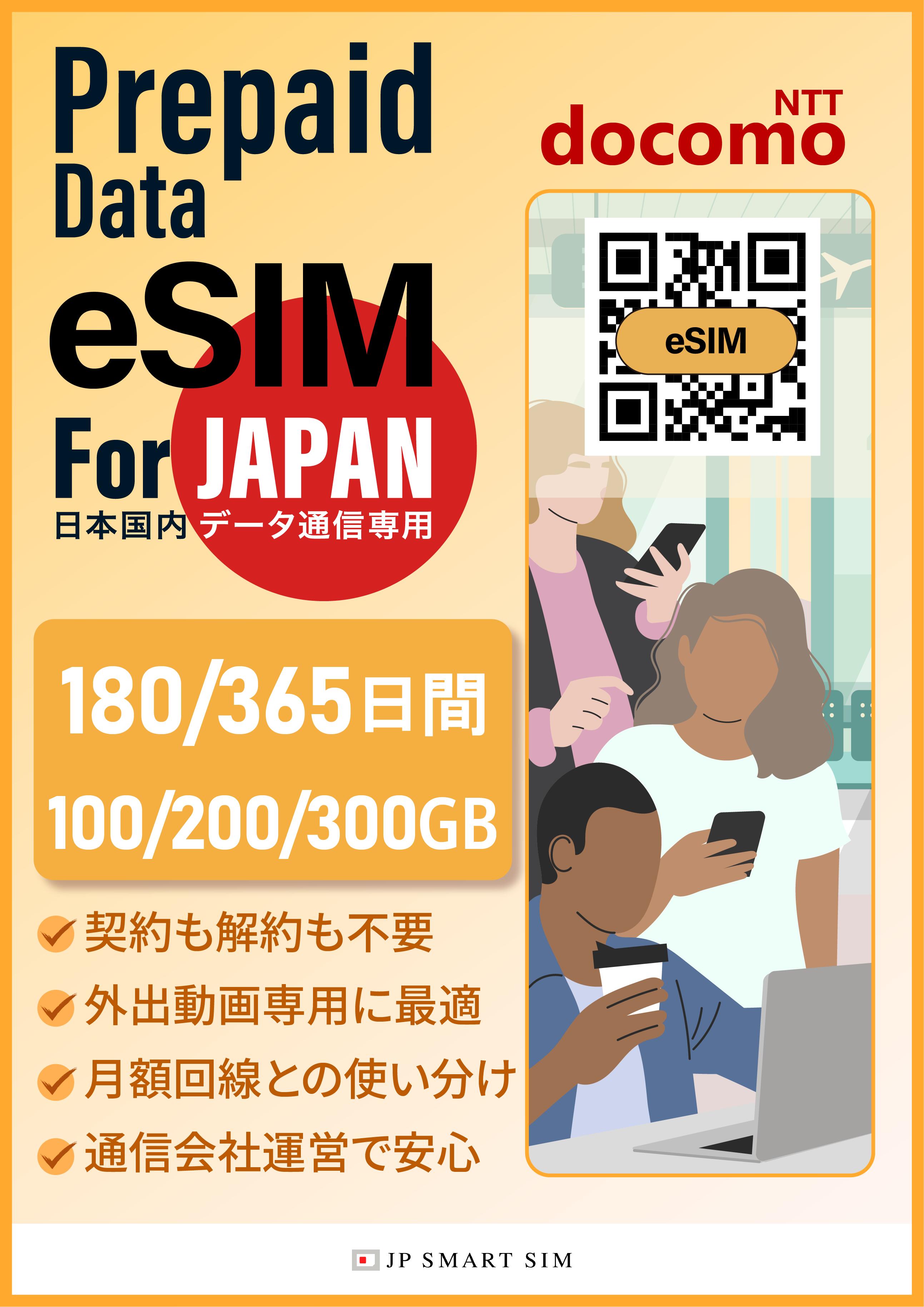 【15%OFF + 10倍ポイントアップ!!】日本eSIM 180日間 / 365日間 100GB / 200GB / 300GB 長期日本プリペイド eSIM 日本国内専用 4G/LTE対応 データ通信専用 eSIM Prepaid SIM ドコモ Docomo 回線 一時帰国 旅行