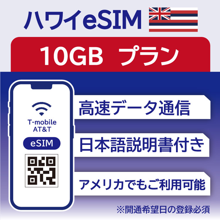 ハワイ eSIM 15日 10GB データ通信のみ可能 T-mobile SIM プリペイドSIM データ 通信 メールで受取 一時帰国 留学 短期 出張