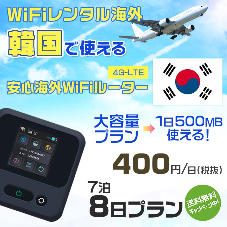 WiFi レンタル 海外 韓国 sim 内蔵 Wi-Fi 海外旅行wifi モバイル ルーター 海外旅行WiFi 7泊8日 プラン wifi 韓国 simカード 8日間 大容量 1日500MB 1日料金 400円 レンタルWiFi海外 即日発送 wifiレンタル Wi-Fiレンタル プリペイド sim 韓国 8日 ワイファイ 空港 旅行