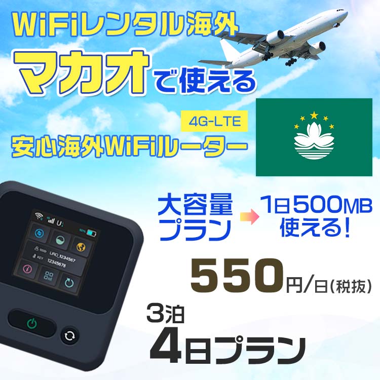 WiFi レンタル 海外 マカオ sim 内蔵 Wi-Fi 海外旅行wifi モバイル ルーター 海外旅行WiFi 3泊4日 プラン wifi マカオ simカード 4日間 大容量 1日500MB 1日料金 550円 レンタルWiFi海外 即日発送 wifiレンタル Wi-Fiレンタル プリペイド sim マカオ 4日 ワイファイ 空港