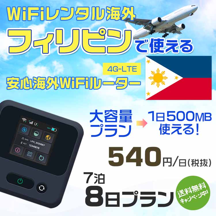 WiFi レンタル 海外 フィリピン sim 内蔵 Wi-Fi 海外旅行wifi モバイル ルーター 海外旅行WiFi 7泊8日 wifi フィリピン simカード 8日間 大容量 1日500MB 1日料金 540円 レンタルWiFi海外 即日発送 wifiレンタル Wi-Fiレンタル プリペイド sim フィリピン 8日 ワイファイ
