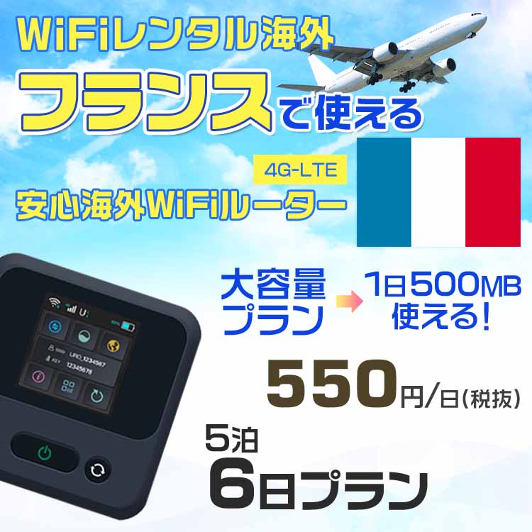 WiFi レンタル 海外 フランス sim 内蔵 Wi-Fi 海外旅行wifi モバイル ルーター 海外旅行WiFi 5泊6日 プラン wifi フランス simカード 6日間 大容量 1日500MB 1日料金550円 レンタルWiFi海外 即日発送 wifiレンタル Wi-Fiレンタル プリペイド sim フランス 6日 ワイファイ