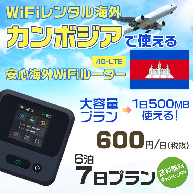 WiFi レンタル 海外 カンボジア sim 内蔵 Wi-Fi 海外旅行wifi モバイル ルーター 海外旅行WiFi 6泊7日 wifi カンボジア simカード 7日間 大容量 1日500MB 1日料金600円 レンタルWiFi海外 即日発送 wifiレンタル Wi-Fiレンタル プリペイド sim カンボジア 7日 ワイファイ