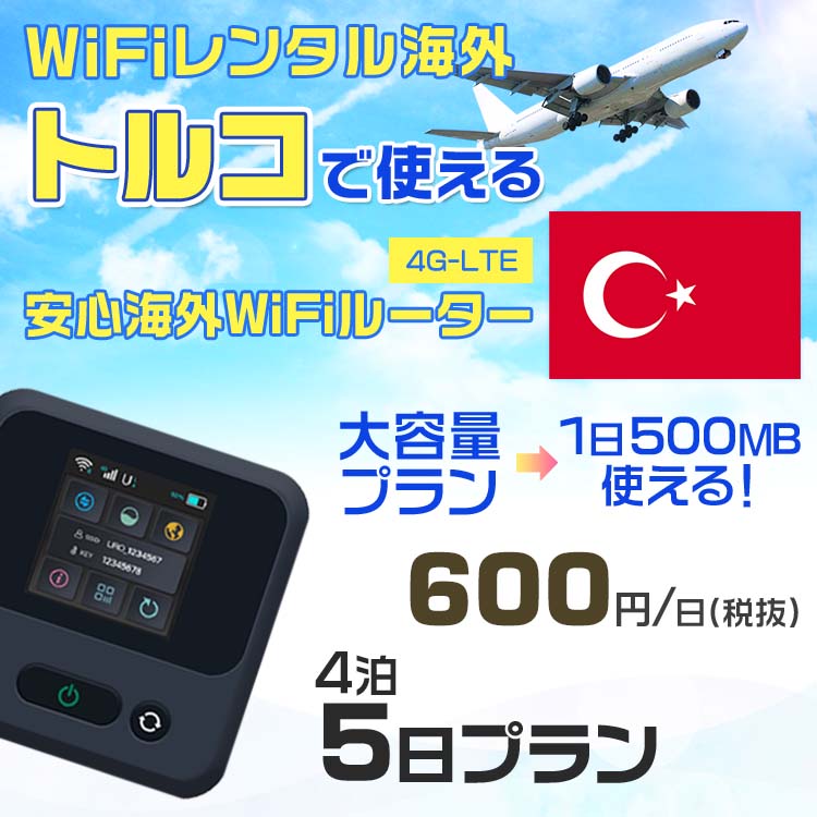 WiFi レンタル 海外 トルコ sim 内蔵 Wi-Fi 海外旅行wifi モバイル ルーター 海外旅行WiFi 4泊5日 プラン wifi トルコ simカード 5日間 大容量 1日500MB 1日料金 600円 レンタルWiFi海外 即日発送 wifiレンタル Wi-Fiレンタル プリペイド sim トルコ 5日 ワイファイ 空港