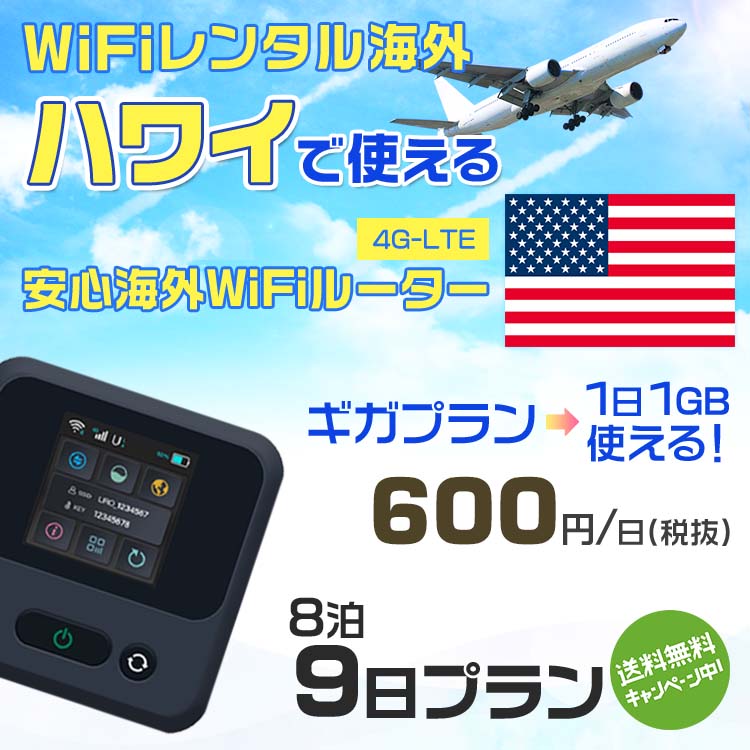 WiFi レンタル 海外 ハワイ sim 内蔵 Wi-Fi 海外旅行wifi モバイル ルーター 海外旅行WiFi 8泊9日 プラン wifi ハワイ simカード 9日間 ギガプラン 1日1GB1日料金600円 レンタルWiFi海外 即日発送 wifiレンタル Wi-Fiレンタル プリペイド sim ハワイ 9日 ワイファイ 空港
