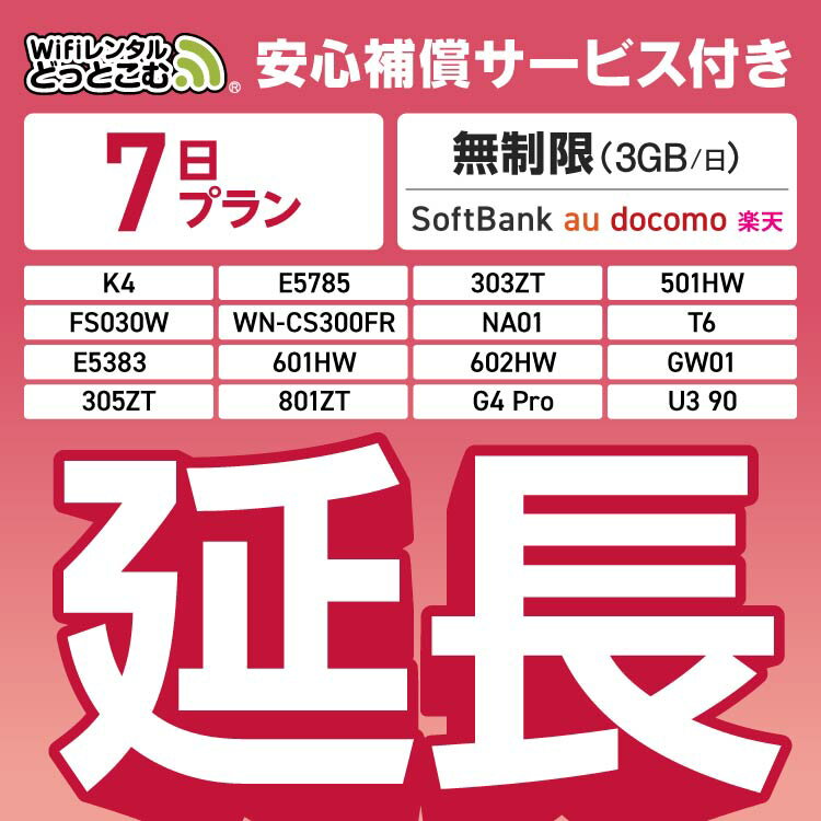【延長専用】安心補償付き SoftBank 無制限 K4 501HW 303ZT E5785 FS030W NA01 WN-CS300FR E5383 T6 無制限 wifi レンタル 延長 専用 7日 ポケットwifi Pocket WiFi レンタルwifi ルーター wi-fi 中継器 wifiレンタル ポケットWiFi ポケットWi-Fi WiFiレンタルどっとこむ