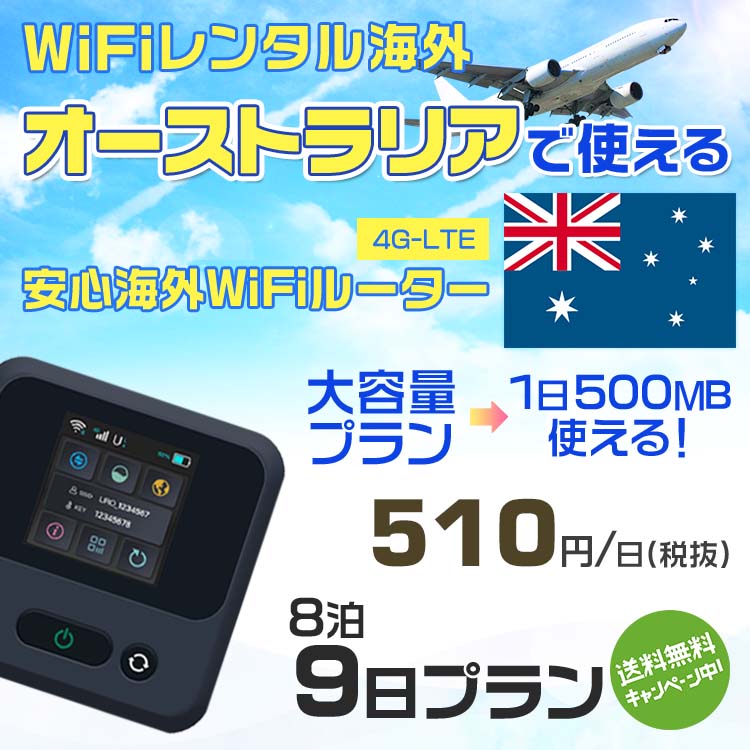WiFi レンタル 海外 オーストラリア sim 内蔵 Wi-Fi 海外旅行wifi モバイル ルーター 海外旅行WiFi 8泊9日 wifi オーストラリア simカード 9日間 大容量 1日500MB 1日 510円 レンタルWiFi海外 即日発送 wifiレンタル Wi-Fiレンタル sim オーストラリア 9日 ワイファイ