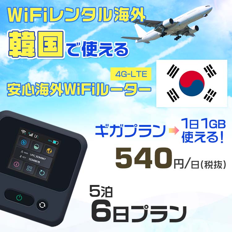 WiFi レンタル 海外 韓国 sim 内蔵 Wi-Fi 海外旅行wifi モバイル ルーター 海外旅行WiFi 5泊6日 プラン wifi 韓国 simカード 6日間 ギガプラン 1日1GB 1日料金 540円 レンタルWiFi海外 即日発送 wifiレンタル Wi-Fiレンタル プリペイド sim 韓国 6日 ワイファイ 空港