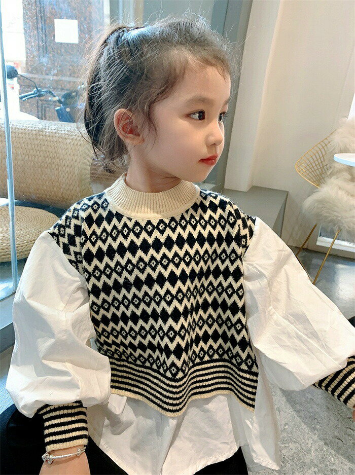 送料無料 ベスト レイヤードシャツ 子供服 子供 服 春秋 新作 トップス シフォン シャツ ブラウス モノトーン 長袖 ベスト 重ね着風 おしゃれ ママサイズ ルーズ 女の子 キッズ ジュニア