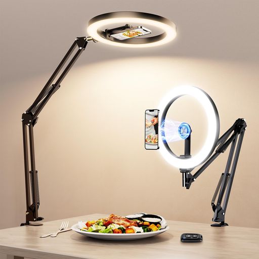 📸【1秒で思い通りに!自在に動くアーム&360°回転ボールヘッド】金属製アームをサッと引くだけで、ライトの角度や距離が瞬時に調整完了!ネジを回す手間なしで両手フリー。撮影の流れを止めず、いつでもベストポジションをゲット!アームとライトは360度ぐるりと回転可能な自由雲台(ボールヘッド)付きで、角度や距離の細かい調整が自由自在。使わないときはコンパクトに折りたためて、狭い場所でもスッキリ収納。あなたのクリエイティブをサポートするマストアイテムです! 🦾【プロの現場にふさわしい、揺れ知らずの安定性】高品質アルミ合金製のアームに、ダブルスプリング構造を搭載。最大荷重1.5kgに対応し、マイクやスマホ、補助ライトなどをしっかりと支えます。スマホスタンドライト付きなので、別途照明の準備も不要。シリコン付きC型クランプは最大5.5cmまで対応し、調理台やデスクに傷をつけず、安心して長時間の撮影に集中できます。俯瞰撮影スマホスタンドとして、プロレベルの安定感を実現します。 💡【2700K〜6500Kの3色光で“映える”配信ライティング】料理の色味を“美味しそう”に、顔の印象を“明るく”演出するならこのライト。