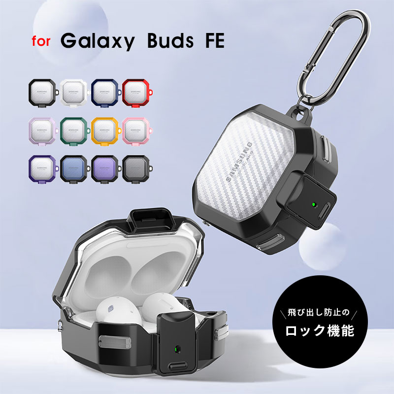 Galaxy Buds FEケース カラビナ付 ギャラクシー バッズ FEケース 安全ロック付き galaxy buds fe カバー 耐衝撃 イヤホンケース クリアケース ギャラクシー Buds FEケース 紛失防止 Galaxy buds fe ケース 充電ケース 落下防止 全面保護 装着充電可能 カーボン調