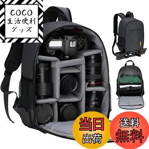 商品情報商品の説明主な仕様 【プロのカメラバックパック】自由組み合わせ可能な綿入り仕切り板付き、カメラ機材などをしっかり守ります。カメラバッグの底にカメラ三脚を取り付けることができます。br【十分な容量】カメラ1台+レンズ6個+フレッシュトリガー1個を同時収納可能です。内側にはアクセサリーやiPadなどタブレット用のジッパー式メッシュポケットがあります。高弾性メッシュのサイドポケットにはボトルや傘などが収納できます。br【軽量&コンパクト】外寸は約39cm*29cm*15cmとなります。重量はたった850gとなります。カメラバックパックとして、羽のように軽くて、街撮影にピッタリします。飛行機内に持ち込みするのも可能で、最大限に活用することができます。br【頑丈で耐久性高い】撥水加工のほか、防水のレインカバーが付属します。どんな天気でもご使用可能なカメラバッグです。通気性のあるショルダーストラップは頑丈で、パッドがしっかり入っていて、簡単に調整できます。背部もクッションパッドが付き、必要な快適さと通気性を提供します。br【多機能】このカメラバッグは仕切り板を取り外すと軽量かつシンプルなストレートシティデイパックに変換できます。十分の収納ポーチが内蔵するので日常用や短期間の旅には最適です。ブラックの外見は実用性がもっとも高いです。カメラバックパックにご満足いただけない場合やご不明な点がございましたら、お気軽にお問い合わせください。 TARIONはいつもお待ちしております。