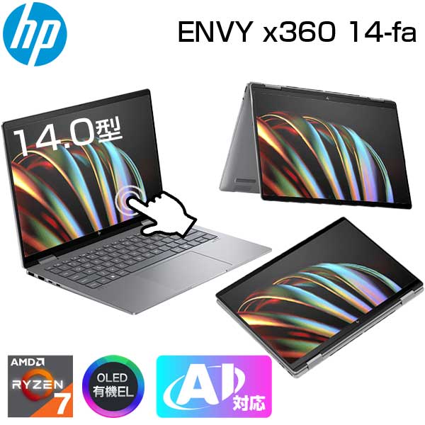 【AI 搭載 タッチパネル 対応】 HP 2in1 ノートパソコン ENVY x360 14-fa0001AU 14.0インチ 2.8K 2880x1800 OLED 有機EL 120Hz AMD Ryzen 7 8840HS メモリ 32GB SSD 1TB Windows11 無線LAN IR WEBカメラ 顔認証 メテオシルバー ノート PC パソコン