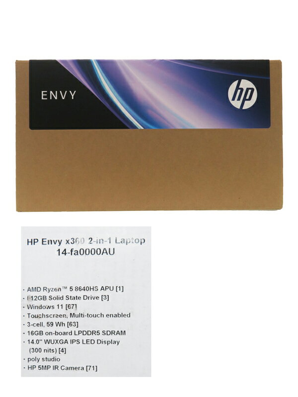 【HP】【訳あり未使用品】日本HP『HP ENVY x360 2-in-1 Laptop / 14inch / Ryzen 5 / 16GB / 512GB / メテオシルバー』14-fa0000AU ノートPC 1週間保証【中古】 名 称 HP ENVY x360 2-in-1 Laptop / 14inch / Ryzen 5 / 16GB / 512GB / メテオシルバー 型 番 14-fa0000AU 年 式 2024年3月発売 カラー メテオシルバー 種 類 ノートパソコン 付属品 HP 430 マルチデバイスワイヤレスマウス(ブラック/単3電池×1)、ACアダプター、電源コード、保証書等 保証期間 1週間保証 ランク SA品 状 態 未開封 未使用品です。 外箱に送り状を剥がした跡が見られ、べたつきます。外箱に汚れが見られます。 本体・付属品に影響は見られません。 ●OS:Windows 11 Home ●プロセッサー:AMD Ryzen 5 8640HS 6コア/12スレッド プロセッサー + Radeon グラフィックス (最大 16 NPU TOPS) ●メモリ:16GB オンボード ●ストレージ:512GB PCIe Gen4 NVMe M.2 SSD ●内蔵無線LAN:IEEE 802.11ax (Wi-Fi 6E)、 Bluetooth 5.3 ●ディスプレイ:14.0インチ WUXGA IPSタッチディスプレイ ●キーボード:日本語配列 ●インターフェイス: ・HDMI 2.1 出力端子 ×1 ・SuperSpeed USB Type-C 10Gbps ×2 ・SuperSpeed USB Type-A 10Gbps ×2 ・ヘッドフォン出力/マイク入力コンボポート ×1 ●サイズ(幅x奥行きx高さ):約313×218×16.9mm (最厚部) ●質量:約1.39kg 【14.0インチ】