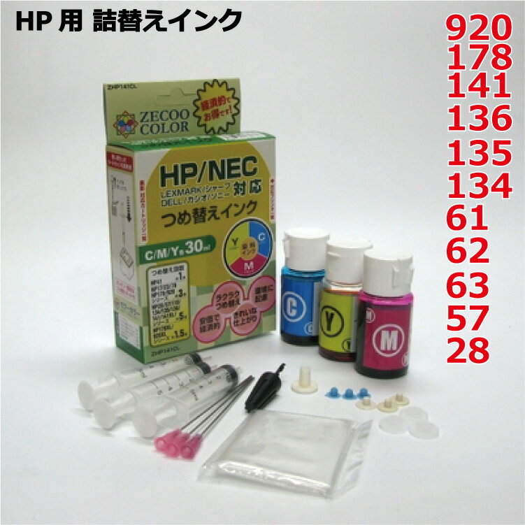 HP/NEC/シャープ/カシオ/ソニー/レックスマーク/DELL/用詰替えインク【カラーC,M,Y】(3色インク)(器具付き)詰め替えインクでも綺麗に印刷したーい!そんな方にお勧め!全色詰め替えて写真印刷にどうぞ!各色カラーも高品質のインクを採用しています。 カラー シアン(C:青)(染料)マゼンタ(M:赤)(染料)イエロー(Y:黄)(染料) 内容量 各30ml 付属品 インジェクター(3個)/インジェクターノズル(長)(3個)/ポケットドリル(1個)/エアヌキ(3個)/オープナー(3個)/シリコン蓋(3個)/出口ガード小(3個)/手袋(1組 特記事項 ※詰め替えに必要な器具等は入っています。 ※本製品は HP社/NEC(株)/シャープ(株)/カシオ(株)/ソニー(株)/レックスマーク社/DELL(株) とは無関係で承認を受けたものではありません。 【HP】/DeskJet 450cbi/DeskJet 5160/DeskJet 5550/DeskJet 5551/DeskJet 5650/DeskJet 5850/OfficeJet 5510/OfficeJet 6150/PhotoSmart 7350/PhotoSmart 7550/PSC 1210/PSC 1315/PSC 1350/PSC 2110/PSC 2150/PSC 2310/PSC 2450/PSC 2550/DeskJet 460c/DeskJet 460cb/DeskJet 5740/DeskJet 6840/OfficeJet 7210/OfficeJet 7410/PhotoSmart 2610/PhotoSmart 2710/DeskJet D4160/OfficeJet 6210/PSC 1610/PSC 2355/OfficeJet 6310/PhotoSmart C4175/PhotoSmart C4180/PhotoSmart 2575/PhotoSmart D5160/OfficeJet 100 Mobile/OfficeJet H470/PhotoSmart 7830/PhotoSmart 8753/PhotoSmart C3175/PhotoSmart C3180/PSC 1510/OfficeJet J5780/OfficeJet J6480/PhotoSmart C4275/PhotoSmart C4380/PhotoSmart C4480/PhotoSmart C4486/PhotoSmart C4490/PhotoSmart C4580/PhotoSmart C5280/PhotoSmart D5360/PhotoSmart 325/PhotoSmart 335/PhotoSmart 385/PhotoSmart 475/DeskJet 3420/DeskJet 3550/DeskJet 710C/DeskJet 720C/DeskJet 815C/DeskJet 815C-SW/DeskJet 880C/DeskJet 895C/DeskJet 895CXI/DeskJet 1120C/DeskJet 1125C/PSC 750/DeskJet 845C/DeskJet 840C/DesignJet 230/DesignJet 250C/DesignJet 330/DesignJet 430/DesignJet 650C/DesignJet 350C/DesignJet 450C/DesignJet 488CA/DeskJet 850C/DesignJet 700/DesignJet 750/DesignJet 750C/DesignJet 750CPlus/DeskJet 930C/DeskJet 955C/DeskJet 957C/DeskJet 970CXI/DeskJet 990C/DeskJet 990CXI/DeskJet 1220C/PhotoSmart 1000/PhotoSmart 1215/PhotoSmart 1315/PhotoSmart P1000/PhotoSmart P1100/DeskJet 948C/DeskJet 1200C/DeskJet 3070A/PhotoSmart 5510/PhotoSmart 5520/PhotoSmart 5521/PhotoSmart 6510/PhotoSmart 6520/PhotoSmart 6521/PhotoSmart B109A/PhotoSmart C5380/PhotoSmart C6380/PhotoSmart D5460/PhotoSmart Plus B209A/PhotoSmart Premium FAX All-in-One C309a/PhotoSmart Premium C309G/PhotoSmart Premium C310c/PhotoSmart Wireless B109N/PhotoSmart Wireless B110a/PhotoSmart Plus B210a/OfficeJet 7500A/OfficeJet 6500A Plus/OfficeJet 6500A/OfficeJet 6500 Wireless/OfficeJet 6500/OfficeJet 6000/OfficeJet 7000/OfficeJet 4620 【HP/NEC/SHARP/CASIO/SONY】HP17/HP23/HP28/HP41/HP57/HP61/HP62/HP63/HP78/HP134/HP135/HP136/HP141/HP141XLC/HP141XLM/HP141XLY/HP178C/HP178M/HP178Y/HP178XLC/HP178XLM/HP178XLY/HP920C/HP920M/HP920Y/HP920XLC/HP920XLM/HP920XLY【LEXMARK】#1/#19/#20/#29/#33/#35/#60/#80【DELL】T5030/JF3