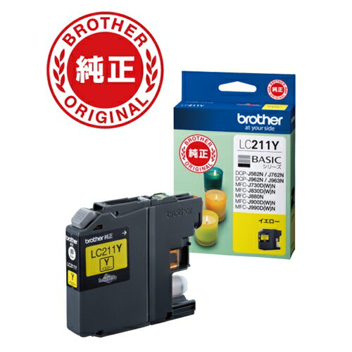 ブラザー LC211Y 【純正】インクカートリッジ (イエロー)発売日:2015年09月24日●純正インクで最適な画質を!インクはインクカートリッジから製品本体のチューブを通りプリントヘッドに送りこまれます。プリントヘッドに送りこまれたインクは流路を通りノズルから吐出されます。純正インクは最適な印字結果(シャープな文字、粒状感の少ない、なめらかな写真画質など)を実現するために製品特性にあわせて研究開発されています。【仕様】対応プリンタ:DCP-J968N、DCP-J767N、DCP-J567N、MFC-J887N、MFC-J997DN、MFC-J997DWN、MFC-J737DN、MFC-J737DWN、MFC-J837DN、MFC-J837DWN、MFC-J907DN、MFC-J907DWN、DCP-J963N、DCP-J762N、DCP-J562N、MFC-J880N、MFC-J990DN、MFC-J990DWN、MFC-J730DN、MFC-J730DWN、MFC-J830DN、MFC-J830DWN、MFC-J900DN、MFC-J900DWN