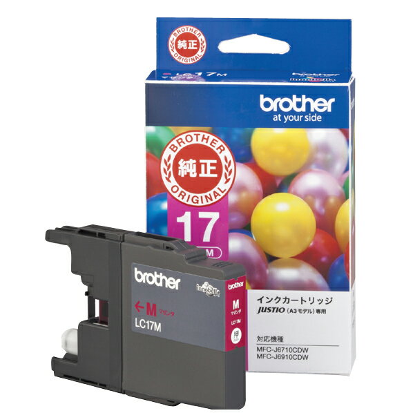 [ブラザー インクカートリッジ LC17M]の商品説明マゼンダのインクカートリッジです。[ブラザー インクカートリッジ LC17M]のスペック●対応機種:MFC-J6910CDW、MFC-J6710CDW、MFC-J5910CDW○返品不可対象商品