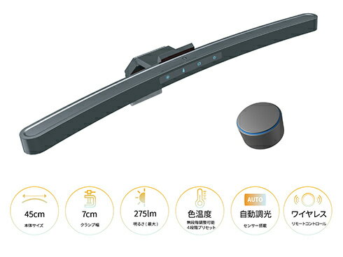 モニターライト/2年保証 ディスプレイ上部に取り付ける省スペース設計のモニターライトです。デスクのスペースを確保しながら、しっかりと照らし、作業効率を高めます。反射や映り込みを抑えることで目の負担を軽減し、長時間のパソコン作業や読書、学習もサポートします。湾曲モニターに沿うアーチ形状を採用した湾曲モニターライトです。明るさは最大275lm。色温度は、無段階での微調整に加え、4種類のプリセットからも簡単に選択可能です。使う場所や時間帯に合わせて、すぐに最適な明るさに切り替えられます。自動調光機能を搭載。内蔵センサーが周囲の照度を感知し、ライトの明るさを自動で調整。昼夜を問わず、目にやさしい快適な作業環境をサポートします。*自動調光機能は、On/Offの切り替えが可能です。ワイヤレスリモコンを同梱し、明るさや色温度を簡単に操作できます。ケーブル不要のワイヤレス仕様です。演色評価数(CRI):95以上を実現。演色評価数(CRI:Color Rendering Index)とは、光源が物体の色をどれだけ自然に再現できるかを示す指標です。数値は0100で表され、数値が高いほど自然光(太陽光)に近く、より自然な色合いで物が見えるようになります。本製品には、2年間のメーカー保証が付きます。 詳細スペック 電気用品安全法(本体)非対象 電気用品安全法(付属品等)非対象