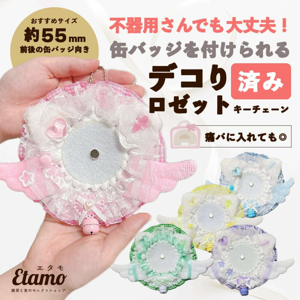 推しの缶バッジを取り付けるだけで完成♪ 不器用さんや忙しくて時間の無い方でも 簡単に推しのロゼットが作れる『デコり済みロゼット』です。 たっぷりのフリルやレースに、 猫耳や天使の羽など可愛らしいパーツをたっぷり詰め込みました♪ バッグに付けて出かけたり 痛バの中に飾ってみたり… もちろんお部屋にディスプレイするのも◎ 約55mm前後のサイズの缶バッジがおすすめです。 バッグに取り付けられるボールチェーン付き ロゼット中心部にあるシルバーの小さいパーツはマグネットです。 磁石で取り付け可能なグッズをくっつけて飾ることもできます。 針を刺さずに マグネットのみを活用する際は お部屋の中で鑑賞用としてお楽しみください。 現在カラーバリエーションは全部で5種! ぜひ推しのメンバーカラーやユニットカラー、グッズの雰囲気に合わせて コーディネートをお楽しみください? 推しやグループ毎に一つ一つコーディネートを変えてみるのも◎ 当店ではクリアポーチやアクスタケース、ネームホルダー、 ペンライトポーチやぬい服など他にも推し活グッズを多数ご用意しております! ぜひ充実した推し活ライフをお楽しみください♪ 《 製品詳細 》 種類:オプションよりご希望のデザインをお選び下さい。 個数:1点 ※商品写真はイメージです。 ※各商品写真の色合いは、モニターの設定などにより実際の商品と異なる場合がございます。 あらかじめご了承ください。 ▼ エタモの推し活特集ページはこちら♪ ▼ ▼ 新色登場!! エタモ錦糸町本店で人気のヘアバンド ▼ ショップトップへ戻る